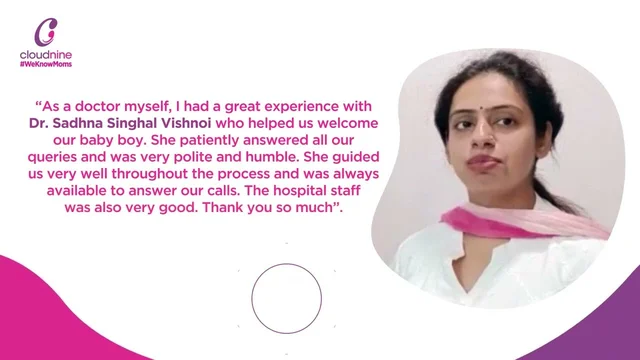 "As a doctor myself, I had a great experience with Dr. Sadhna Singhal Vishnoi who helped us welcome our baby boy. She patiently answered all our queries and was very polite and humble. She guided us very well throughout the process and was always available to answer our calls. The hospital staff was also very good. Thank you so much"